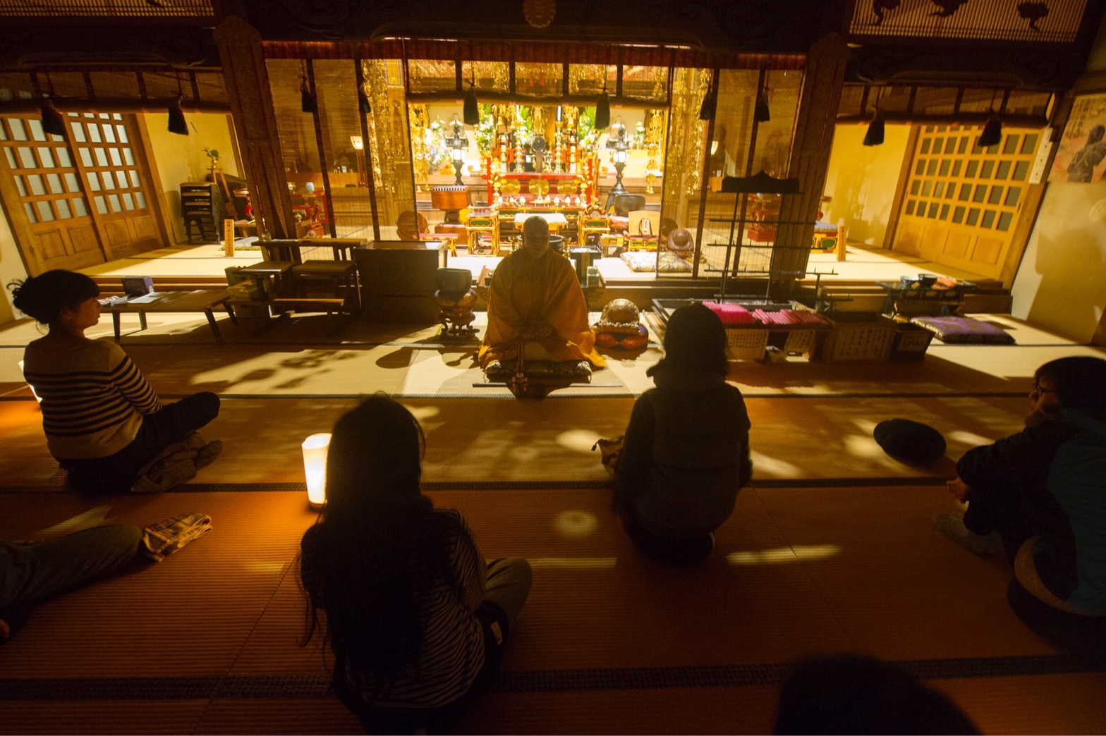 住職の指導のもと、わずかなキャンドルの灯りがともる本堂内で、夜の山ならではの自然と生命の息づかいを感じながら30分ほど集中します。
