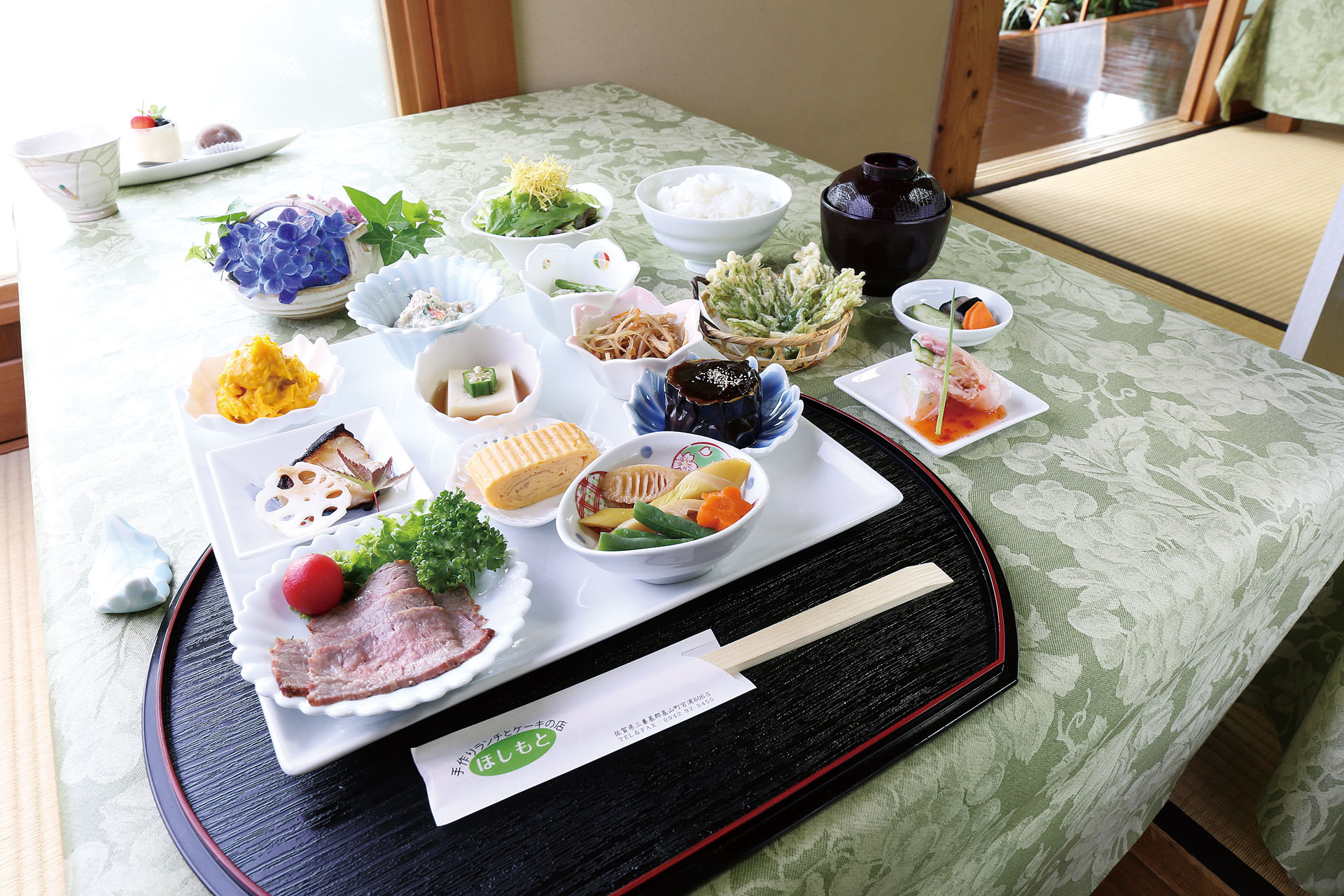 基本的なメニューは、お昼のランチと夜のコース料理のみで、どちらも予約制となっております。佐賀牛A5等級肉を使ったローストビーフ、地元の季節野菜、ブリの塩麹焼きなど、食材にこだわった料理の数々をご賞味ください。