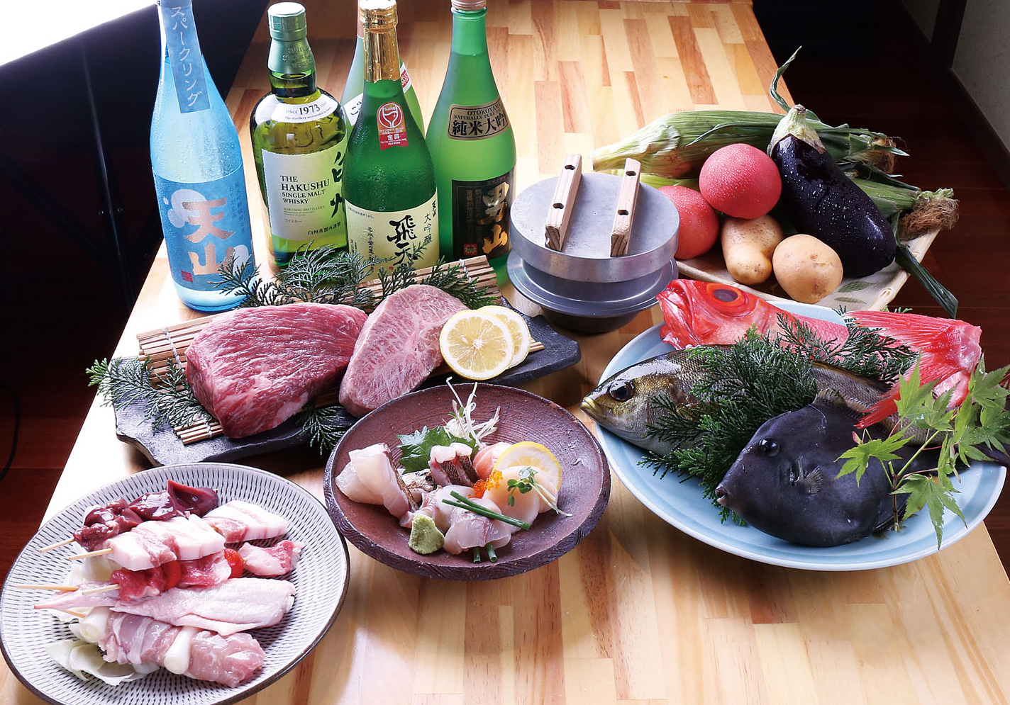 毎日仕入れる鮮度抜群のお刺身、佐賀牛・有明鶏・朝引き鶏・鹿児島黒豚の串焼き、佐賀産米の釜飯など絶品料理を取り揃え、料理に合わせた日本酒、ワインも季節ものを約20種ご用意。