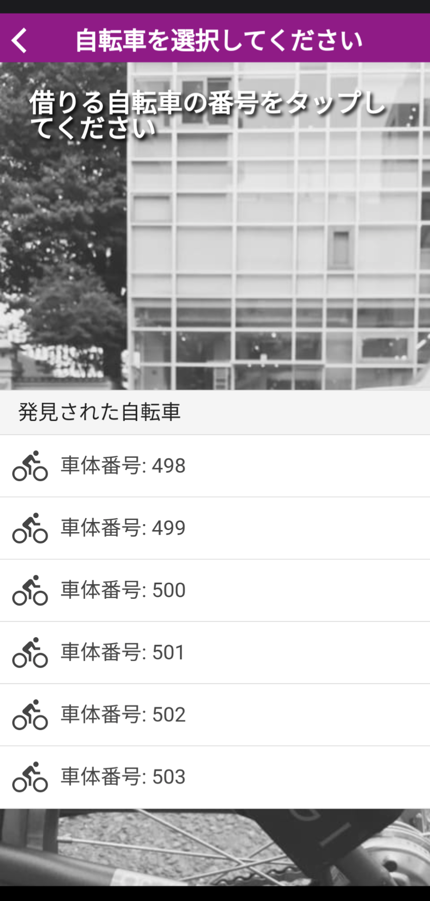 発見された自転車からご希望の自転車を選択してください。