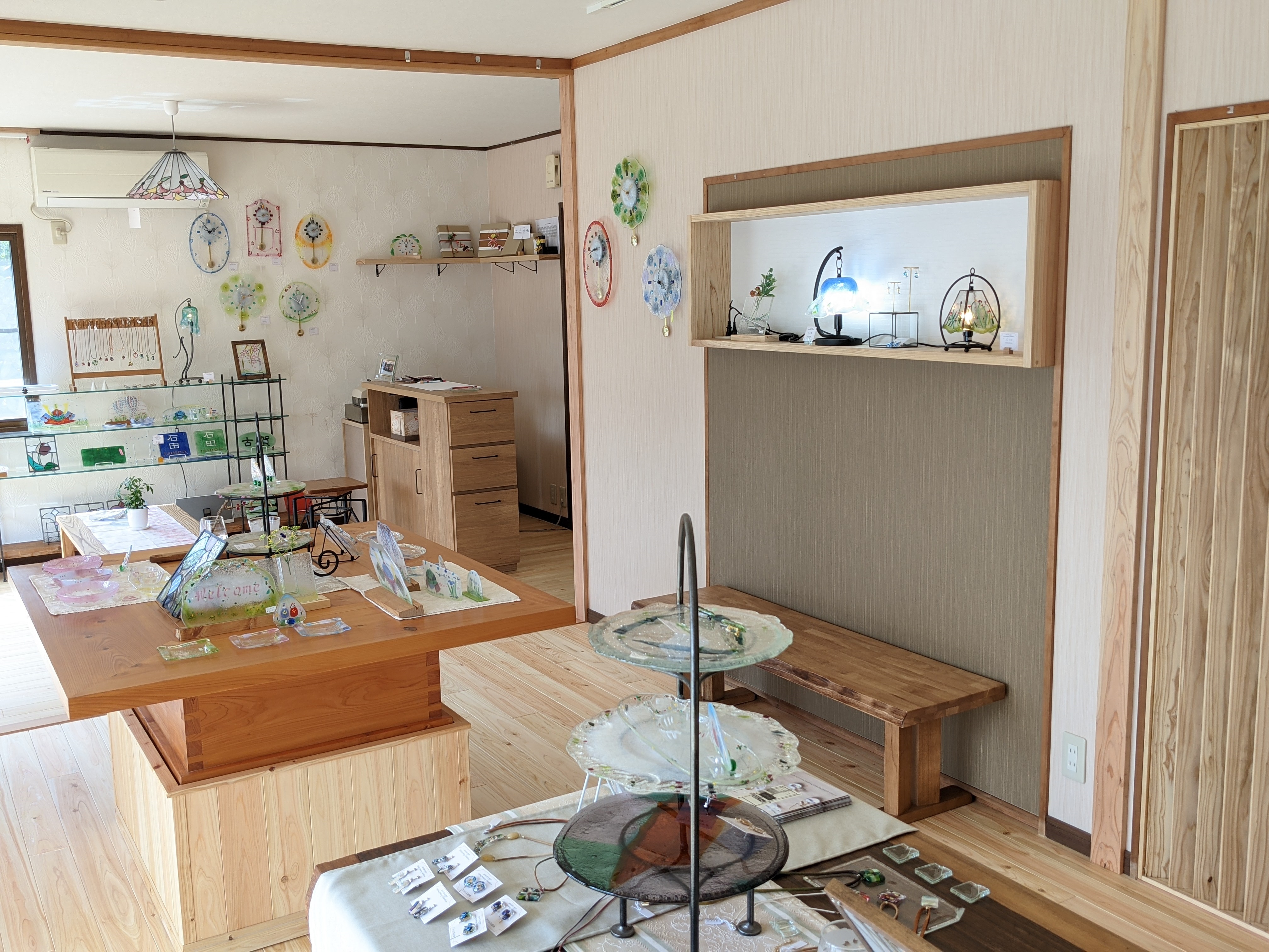 1階のギャラリーではステンドグラスやお皿・イヤリングやピアス等さまざまなガラス製品が展示されており